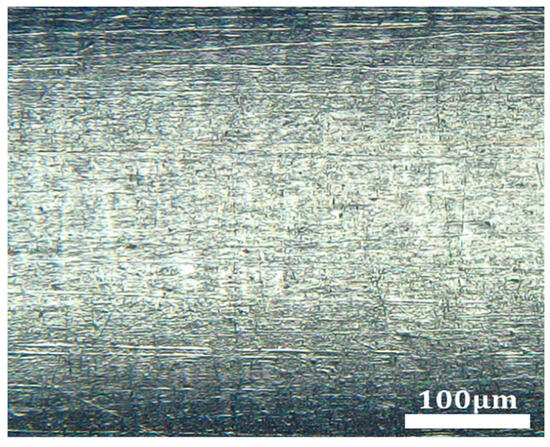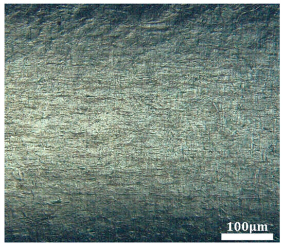 Figure 17 illustrates the surface morphology after processing with the optimized parameters. Compared to Figure 16, there is a noticeable reduction in the number of scratches, and the surface appears more uniform and smoother. This indicates a further enhancement in surface quality, with a measured roughness value of 0.104 µm.
