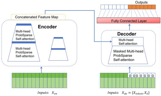 Recent literature [18] has introduced the encoder–decoder transformer model, which does not require consideration of time and distance in time series predictions, offering potential for handling long-term dependencies and parallel computation and significantly reducing computational resource consumption. The INFORMER model was developed to reduce the time complexity of transformer models by optimizing the self-attention mechanism with sparse probability self-attention. This innovation lowers time complexity and enables long-sequence outputs with a single fully connected layer.