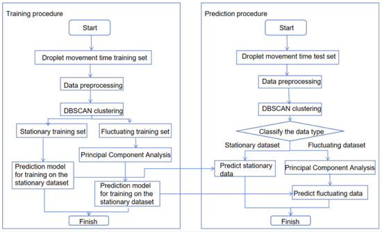 The workflow for constructing the prediction model is illustrated in Figure 3, with the goal of developing a droplet motion time prediction model using DBSCAN-PCA-INFORMER for digital microfluidic systems. First, the droplet motion times measured by the machine vision-based digital microfluidic driving control system are preprocessed and used as data samples. The dataset for droplet motion from four chips serves as the training set, while the droplet motion time from one chip is used as the test set. Initially, the training set data is clustered using DBSCAN into a compact steady training set and a dispersed fluctuating training set. For the fluctuating training set, PCA is employed to extract the principal component sequences with high eigenvalues, enabling the identification of similar data for subsequent predictions. The steady training set and the fluctuating dataset are then input into the INFORMER model for training, resulting in corresponding weight files. For the test set, DBSCAN is used again for classification; the steady dataset utilizes the appropriate weight file for prediction, while the fluctuating dataset employs the weight file obtained from training on the PCA-processed fluctuating training set for prediction. Finally, the INFORMER model generates the prediction results, and its performance is assessed through metrics like root mean square error (RMSE) and the coefficient of determination. To verify the model’s generalization ability, test samples measured at varying driving voltages are used, and the model parameters are iteratively refined to develop the final prediction model.