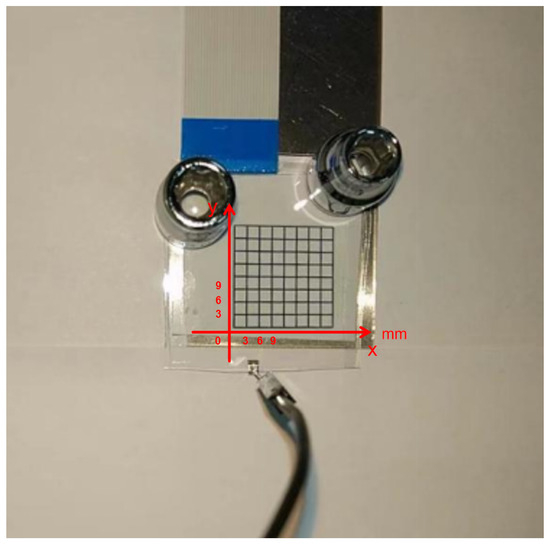 In this study, we utilized micro-mechanical fabrication techniques to manufacture the digital microfluidic chips required for this research in a clean room environment. The physical layout of the device is shown in Figure 5. To simplify the fabrication process and reduce time, we spin-coated a 1000 nm thick layer of Teflon AF1600 material (Chemours, Wilmington, NC, USA) on the ITO layer surfaces of the upper and lower plates of the device, serving as both the dielectric layer and hydrophobic layer. We used SU-8 photoresist (KAYAKU, Westborough, MA, USA) to create support walls for the upper and lower plates of the EWOD device, ensuring sufficient movement space for the droplets between the two plates. The structural parameters of the EWOD device used in this study are as follows: the driving electrodes are square-shaped with a side length of 3 mm, the distance between the driving electrodes is 25 m, the gap between the upper and lower plates of the device is approximately 2 mm, and the droplet volume is about 5 L, with a horizontal diameter of approximately 4 mm on the EWOD device.