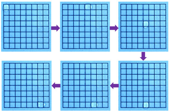 To ensure the stability and reliability of the data while minimizing human intervention, the entire process of driving and timing recording was managed by the machine vision-based digital microfluidic drive control system proposed by the research team [21]. Figure 6 presents a series of screenshots showing the continuous transport of micro-droplets on the EWOD device. To ensure data reliability and continuity, all micro-droplet transport paths in this study were directed from the starting electrode at the top-left corner to the destination electrode at the bottom right corner.