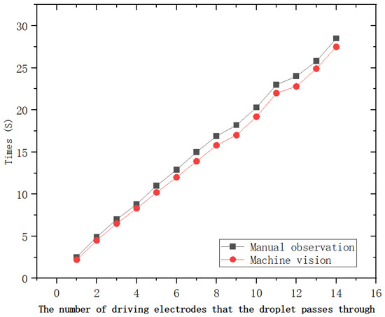In this subsection, we first validate and compare the designed digital microfluidic drive control scheme using manual observation and recording methods. The results of the verification experiments are shown in Figure 7. The experimental results demonstrate that the droplet motion times measured by the machine vision-based digital microfluidic drive control system closely match those obtained through manual observation, with an exceptionally low error rate. Therefore, the droplet motion time data collected by this system can be used for predictions with high reliability.The machine-vision-based digital microfluidic control system operates at a sampling frequency of 30 Hz, and the total number of samples corresponding to the time required for a droplet to fully reach the next electrode is 14,400.