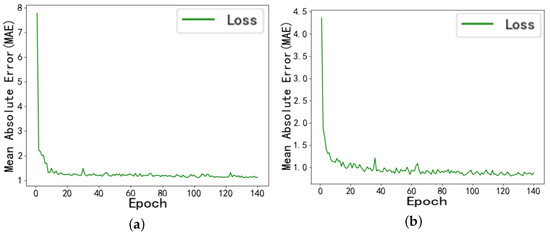 (a) Training error graph of the LSTM prediction model. (b) Training error graph of the DBSCAN-PCA-INFORMER prediction model.