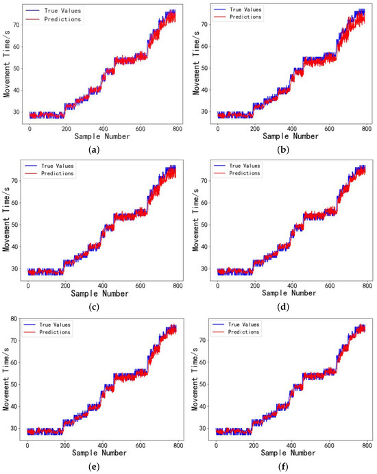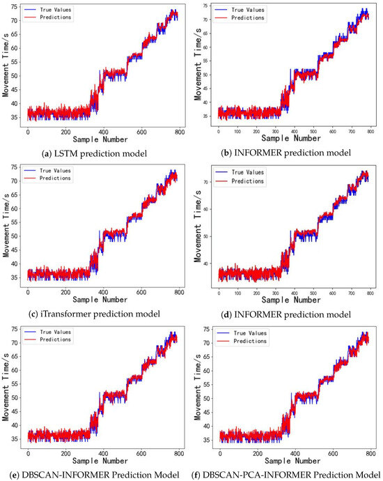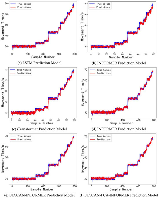 (a) Droplet motion time prediction results for the digital microfluidic system using the LSTM model. (b Droplet motion time prediction results for the digital microfluidic system using the FEDformer model. (c) Droplet motion time prediction results for the digital microfluidic system using the Itransformer model. (d) Droplet motion time prediction results for the digital microfluidic system using the INFORMER model. (e) Droplet motion time prediction results for the digital microfluidic system Using the DBSCAN-INFORMER model. (f) Droplet motion time prediction results for the digital microfluidic system using the DBSCAN-PCA-INFORMER model.