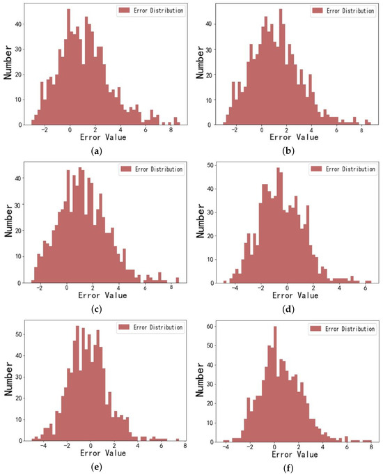 (a) Error distribution graph of droplet motion time prediction for the digital microfluidic system using the LSTM model. (b) Error distribution graph of droplet motion time prediction for the digital microfluidic system using the FEDformer model. (c) Error distribution graph of droplet motion time prediction for the digital microfluidic system using the iTransformer model. (d) Error distribution graph of droplet motion time prediction for the digital microfluidic system using the INFORMER model. (e) Error distribution graph of droplet motion time prediction for the digital microfluidic system using the DBSCAN-INFORMER model. (f) Error distribution graph of droplet motion time prediction for the digital microfluidic system using the DBSCAN-PCA-INFORMER model.