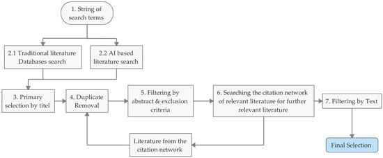 The procedure for systematic literature searches is based on the classical structure and was adapted to include the use of Artificial intelligence (AI) search tools [88,96,97,98]. The search is delineated into eight structured steps, the sequence of which is illustrated in Figure 1. Several search chains were initially constructed from the specified keywords using Boolean operators. These search chains were the foundation for exploring various literature databases in the subsequent step. The methodological approach for literature research included both conventional database searches and AI-supported searches. This two-part approach enhances the reliability of evidence by contributing to the comprehensiveness and robustness of the literature search, thereby establishing a broader foundation of explored literature. First, traditional literature databases were searched using the established search chains. Subsequently, AI tools were employed for further literature searches, whereby the pre-established search chains were converted into prompts optimized for AI utilization. The specific databases and AI tools utilized are enumerated in Table 4.