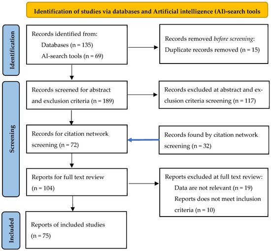 The selection process for the reviewed literature is illustrated in a PRISMA flow diagram, as shown in Figure 2 [92]. The process begins with an initial selection of articles broadly relevant to the research topic. Literature with abstracts aligned to the topic and not excluded by predefined criteria was examined through a citation network to identify additional relevant studies. The amount of scientific literature was continually reduced based on selection criteria, resulting in a final selection of the relevant literature for this study. A list of the relevant literature, organized by application area, is provided in Section 4.
