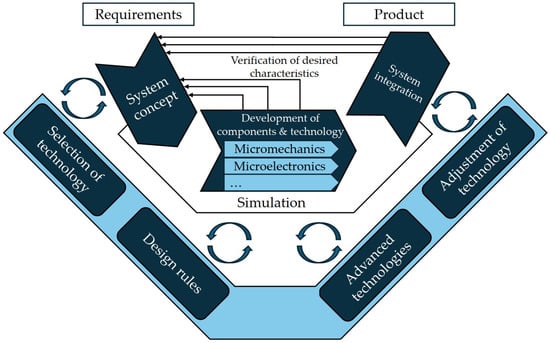Microsystems technology (MST) and especially micro-electro-mechanical systems (MEMS) are of outstanding importance as key technologies of our time [1,2,3,4]. Their continuous development and increasing importance continuously open up new possibilities and applications, which are being intensively researched [2,5,6,7]. Development errors in products and manufacturing processes lead to considerable costs and significant production delays [8,9]. Errors resulting from insufficient or late identification of requirements underline the need for an early and structured approach to process and product development [10,11]. Fast and systematic development is essential to react efficiently to dynamic market requirements. This applies particularly to MST, where the trend is toward individualized products [11]. MST’s high degree of individuality and complexity is reflected in the so-called MEMS law, which states that almost every product requires an individual manufacturing process (one product–one process) [12,13,14,15,16].