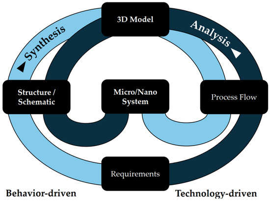 The Process Development Execution System (PDES), supported by the commercial software program XperiDesk, forms a technology management system for process development [13,115,117]. The PDES is based on the pretzel model, which was developed for the integrated development of product and manufacturing processes in MST [43,51,114,116]. The model shown in Figure 5 is characterized by the intertwined design procedures of a behavior-driven top-down synthesis process and a technology-driven bottom-up analysis process [14,42,53,116]. This structure enables an iterative development that effectively describes and structures the development process of MEMS.