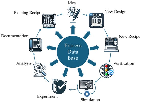 Its strength in the context of PEnv lies in the combination of a knowledge database [53] and an integrated simulation interface [13,14]. All process-relevant parameters can be stored as data in the PDES and included in a simulation interface. This can also be specifically expanded by the user to include PEnv data. In practical terms, this means that developers can define cleanroom class, temperature, or humidity as process parameters, for example, and check their influence. In early development phases, a PDES allows for virtual verification and optimization of processes under different environmental conditions even before real tests are carried out. This forward-looking simulation of “what-if” scenarios is particularly advantageous in order to be able to react quickly to changes in the environment (such as stricter cleanliness requirements or a different plant environment). In the prototype phase, a PDES also offers a tracking environment that monitors real experiments and documents all environmental conditions [13]. This makes deviations between virtual planning and real execution transparent, and process development can be continuously improved. Compared to the other methods, a PDES in conjunction with XperiDesk is characterized by a deep integration of PEnv data via digital knowledge management and simulation, which enables a more accurate estimation of environmental influences. However, the prerequisite for this is that the relevant influencing factors are known and consciously recorded in the database by the user.