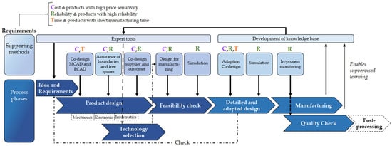 Depending on the specific conditions of each development stage, the use of supporting methods is recommended. The method’s structure is divided into different phases, ranging from conceptualization through design to prototype development and subsequent production. Each phase uses specific tools and techniques to increase development efficiency and ensure product quality. The method uses advanced modeling tools and simulation techniques to make design decisions early in the development process. The modern integration of Co-design CAD (MCAD and ECAD) systems and the application of simulation tools allow for quick reactions to design changes and their efficient implementation [34,48].