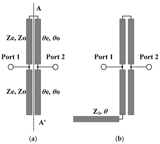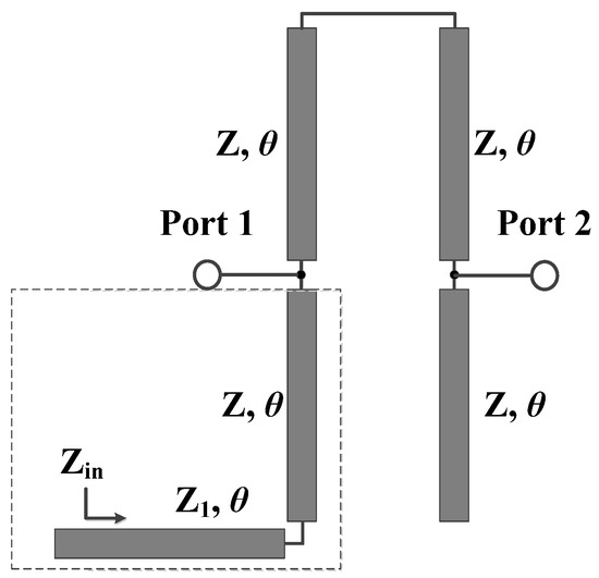 In order to determine the closed-form formulas for the additional transmission zeros, the transmission line equivalent circuit for bandstop filter II, based on conventional coupled microstrip line theory [24], is provided in Figure 5. According to Figure 5, the input impedance of the structure in the dashed-line box can be derived as follows: