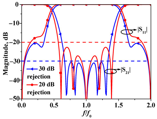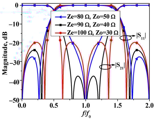 Moreover, two stubs in bandstop filter I are equivalent to quarter-wavelength open-circuited stubs for the input and output ports, thereby generating an additional transmission zero at the center frequency, leading to three transmission zeros across the stopband. According to Equations (4) and (5), it can be observed that, for bandstop filter I, the positions of transmission zeros θz1 and θz2 are primarily determined by the odd–even mode impedance ratio. To illustrate the impact of the odd/even-mode impedances on bandstop filter I more clearly, Figure 3 presents the S-parameters of bandstop filter I under different combinations of odd–even mode impedances. As shown in Figure 3, the stopband attenuation level of bandstop filter I is truly determined by the ratio of the odd/even-mode impedances. Furthermore, based on the results in Figure 3 and taking into account the stopband rejection of the filter and practical fabrication tolerances, Ze = 90 Ω and Zo = 40 Ω are selected for the subsequent filter design.