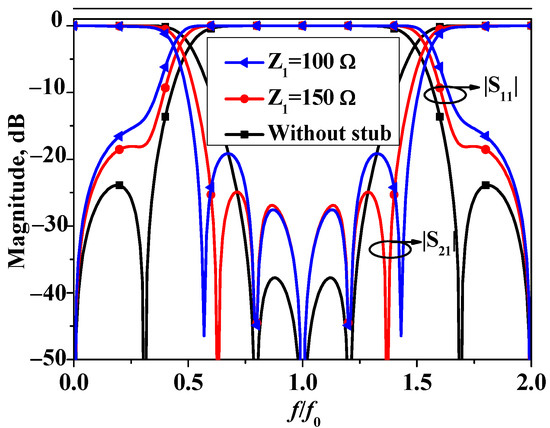 To further enhance the performance of bandstop filter I, a quarter-wavelength-length open-circuited stub with an impedance of Z1 is asymmetrically loaded to one of the open ends of bandstop filter I, which is shown in Figure 1b. Figure 4 exhibits S-parameters of the two bandstop filters under different Z1 values. It can be observed from Figure 4 that the introduction of the open-circuited stub results in two additional transmission zeros. This enhancement increases the stopband bandwidth of the bandstop filter without affecting the previous three transmission zeros.