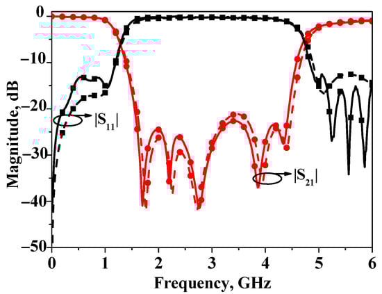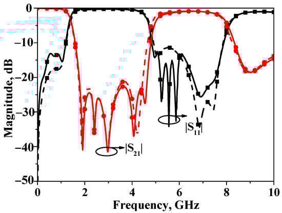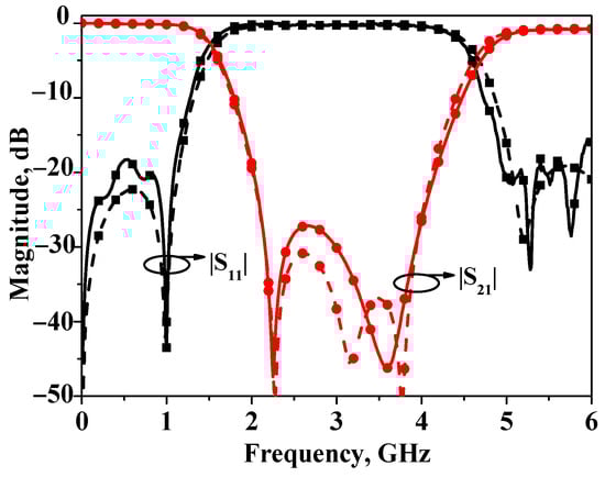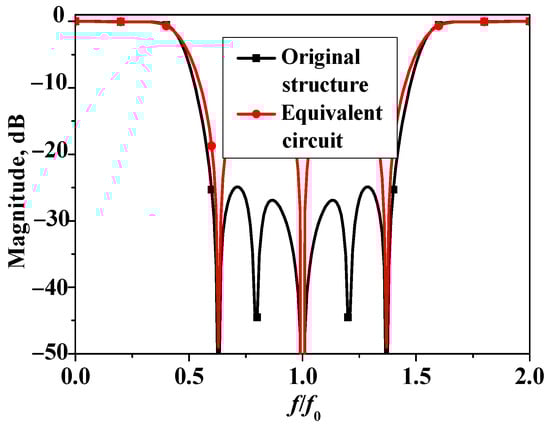 To verify the theoretical analysis and the derived formulas, Figure 6 presents the transmission coefficients of the original structure and the transmission line equivalent circuit of bandstop filter II. As shown in Figure 6, for the equivalent circuit, when the coupling between the two sets of microstrip lines is neglected, transmission zeros θz1 and θz2 will disappear. The positions of the three zeros in the equivalent circuit are basically consistent with those of the transmission zeros generated by the open-circuited stubs in the original structure. This validates the theoretical analysis and the derived closed-form formulas, providing a solid foundation for the subsequent fabrication and testing of the bandstop filter.