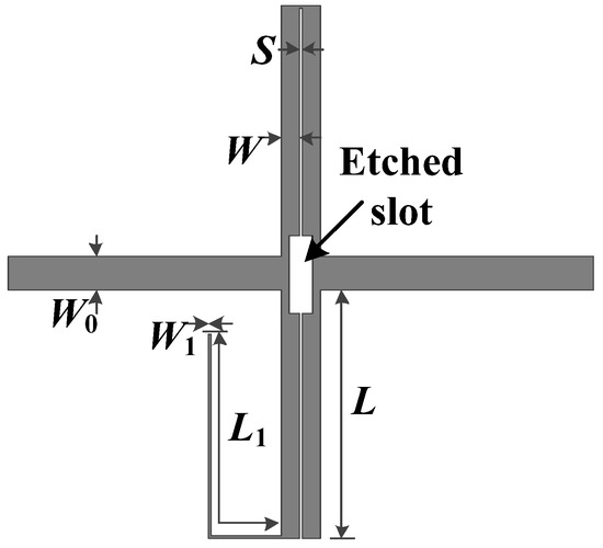 Layout of proposed broadband bandstop filter II. (W0 = 1.95 mm, L = 16.5 mm, W = 1.05 mm, S = 0.1 mm, L1 = 15.9 mm, and W1 = 0.2 mm).