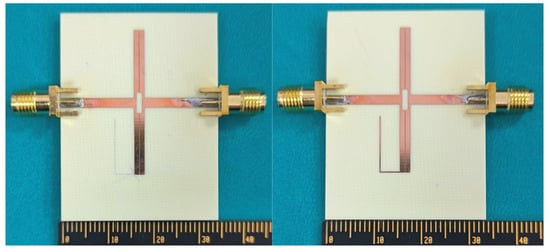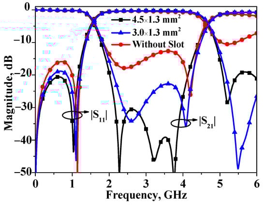 The layout of the proposed broadband bandstop filter II is exhibited in Figure 7. In the preceding analysis, for the sake of simplicity, θe and θo were assumed to be equal, denoted as θ. However, in practice, to ensure the performance of the filter, certain measures still need to be taken to equalize the two values. In order to equalize θe and θo, the primary method involves slotting the inner side of the coupling line. The size of the etched slot for equalization between the two can be obtained via a full-wave simulator. Simulated results of bandstop filter I with different sizes for the etched slot have been plotted in Figure 8. As shown in Figure 8, the size of the etched slot is selected as 4.5 × 1.3 mm2 to realize equalization.