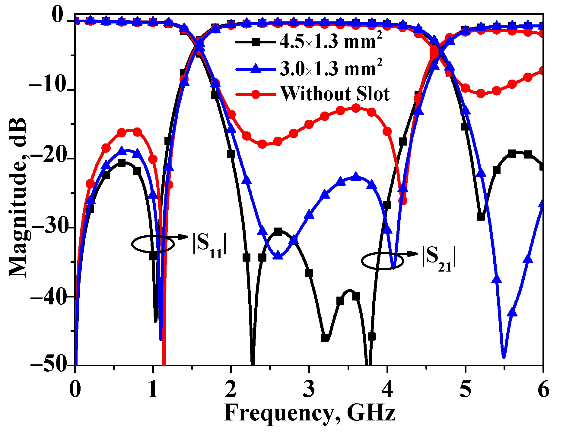 Simulated results of bandstop filter I with different sizes for the etched slot.