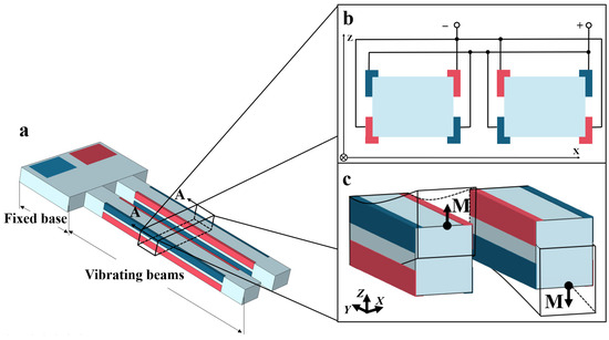 Quartz crystal out-of-plane vibration units have become one of the most widely used and indispensable quartz devices, with applications in gyroscopes [1,2,3], pressure sensors [4,5,6], quartz-enhanced photoacoustic spectroscopy [7,8,9], and on-contact probes [10,11,12]. Figure 1 illustrates the schematic of a typical quartz crystal out-of-plane vibration unit, which consists of a fixed base and two vibrating beams. Notably, the 3D sidewall discrete electrodes are essential structures. Figure 1b shows the layout of the sidewall discrete electrodes on the vibrating beams. When electric fields of opposite polarity are applied to the top and bottom surfaces of the vibrating beams, polarized electric fields are induced along the X-plane of the quartz crystal, generating tensile and compressive stresses in opposite direction along the Y-axis. This stress distribution forces the beams to produce out-of-plane vibrations along the Z-axis, as illustrated in Figure 1c.