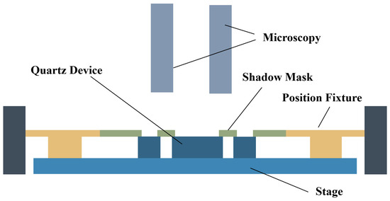 Currently, such 3D sidewall discrete electrodes are typically fabricated using shadow mask and evaporation techniques [2,13,14]. Figure 2 illustrates the equipment used for shadow mask alignment. As shown, the quartz crystal wafer is positioned on a fixed base. The shadow mask, designed with apertures to the layout of the evaporation electrodes, is placed tightly against the surface of the quartz wafer. Both the wafer and the mask are pre-aligned using an external fixture. The relative positions are in-tuned manually through a microscope, ensuring perfect alignment between the quartz wafer and the hard mask. Since the alignment is confirmed, an external fixing peg is used to secure the entire alignment system. The wafer, now covered with the stainless-steel shadow mask, is then placed into metal evaporation deposition equipment to fabricate the sidewall electrodes at an angle. The high collimation provided by the vacuum evaporation process ensures precision during deposition. These steps are repeated for both the front electrodes and the 3D sidewall electrodes. The flow of the deposition process is shown in Figure 3.