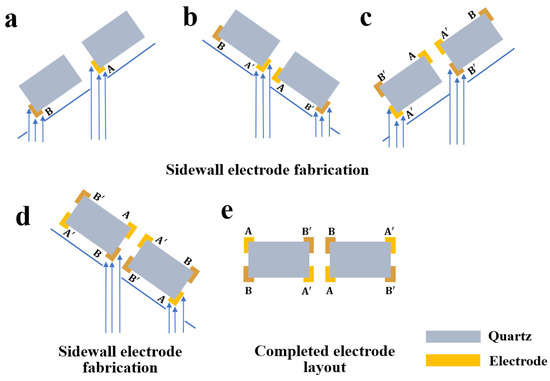 The core principle of the QMEMS adaptive 3D mask sidewall electrode fabrication strategy is to use the beam structure formed by quartz etching as the mask layer of the discrete sidewall electrodes, enabling their fabrication through secondary coating, photolithographic patterning, and the wet etching process. Figure 5 illustrates a schematic diagram of the adaptive 3D mask sidewall electrode fabrication strategy.
