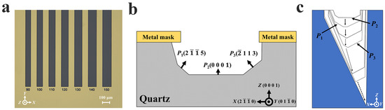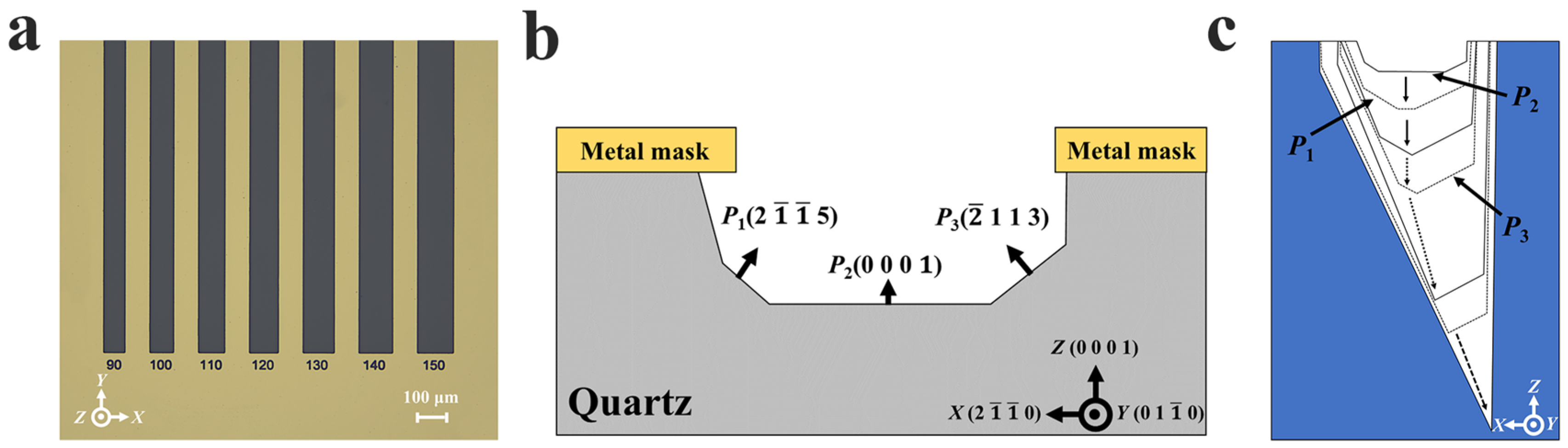 To address the miniaturization requirement of QMEMS devices, this study designed a series of ultra-narrow hard mask patterns to investigate the etching morphology evolution of quartz crystal. The initial long-strip patterns had a width ranging from 10 μm to 150 μm (Figure 4a). The strips measured 1 mm in length, were spaced 500 μm apart, and were aligned along the Y-direction.