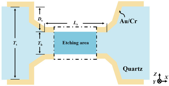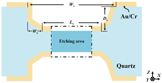 Z-cut quartz crystal wafers with a thickness of 120 μm were used in this study. The wafer, supplied by Crystron Technologies Inc. (Nanjing, China), met the quality requirements of a Q value ≥ 2.4 million and an etched channel density ≤ 30 bars/cm2. Prior to processing, the quartz wafers were cleaned in piranha solution (H2SO4:H2O2 = 3:1) at 90 °C for 20 min. A set of Au (310 nm) and Cr (60 nm) films was sputtered onto the quartz wafers as hard mask layers using a Kurt J. Lesker PVD 75 system (Jefferson Hills, PA 15025 USA). The hard mask layers were subsequently patterned using the designed photoresist mask. Then, etching was performed in a mixed etchant composed of 49 wt. % HF and 40% wt. % NH4F (HF:NH4F = 2:3) at 80 ± 1 °C. Samples were removed from the etchant every 10 min over a total etching time of 120 min. To minimize random errors, three samples were etched simultaneously, and the etching depth of each sample was measured separately.
