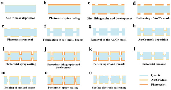 Figure 6 shows the entire process flow of the QMEMS adaptive 3D mask sidewall electrode fabrication strategy. Initially, the wafer surface is cleaned with strong acids and organic solvents. After surface treatment, an Au/Cr mask layer is deposited on both sides of the wafers using vapor deposition or magnetron sputtering (Figure 6a). Next, a photoresist layer is spin-coated onto the wafer (Figure 6b), followed by the first round of double-sided photolithography and development (Figure 6c). The metal hard mask layer is patterned (Figure 6d), and the photoresist is removed (Figure 6e). The wafer is immerged in an etching solution to make the self-masking beam. The corresponding etching depth is selected based on the design of the sidewall electrodes (Figure 6f). Subsequently, the metal mask layer is removed (Figure 6g). After washing, the metal mask layer is re-deposited for the secondary etching process (Figure 6h). A new photoresist is sprayed onto the wafer (Figure 6i), followed by secondary photolithography and development (Figure 6j). The secondary metal layer is etched to pattern the metal mask (Figure 6k), and the photoresist is stripped (Figure 6l). The wafer is then placed in the etching solution once more to remove the self-masking beam through secondary etching. In this process, the Au/Cr film acts as the hard mask on the quartz substrate (Figure 6m). The wafer is coated with photoresist again (Figure 6m) and the surface electrodes are patterned (Figure 6n). Finally, the photoresist is stripped and the wafer cleaned (Figure 6o).