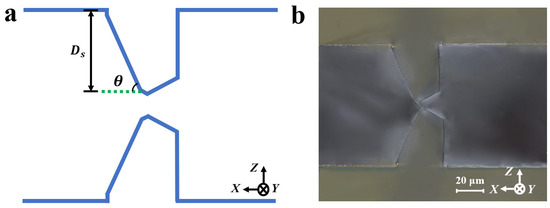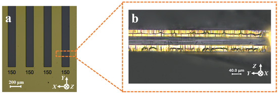 (a) Initial hard mask pattern with a width of 150 μm; (b) fabricated sidewall discrete electrodes with etched grooves of 150 μm.