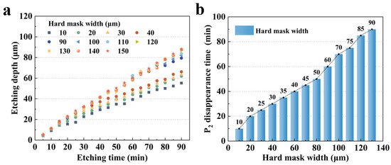 (a) Influence of initial mask width on etching depth during quartz crystal etching; (b) relationship between P2 plane disappearance time and initial hard mask width.