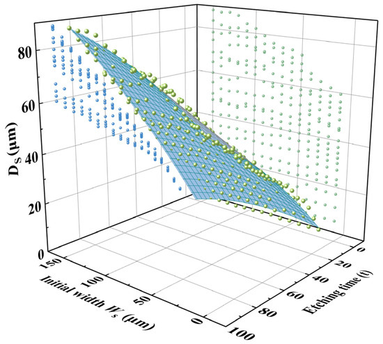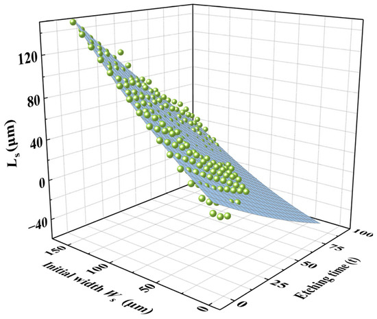 The etching results of initial hard mask widths ranging from 10 μm to 150 μm were plotted into a three-dimensional coordinate system, as shown in Figure 10.