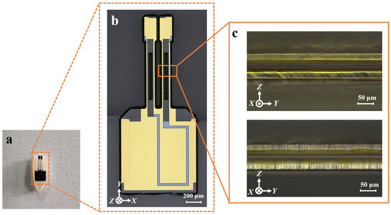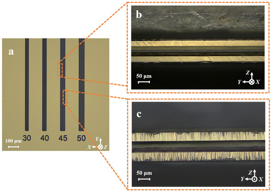 (a) Etching groove with an initial hard mask width of 45 μm; (b) +X-plane sidewall discrete electrode; (c) −X-plane sidewall discrete electrode.