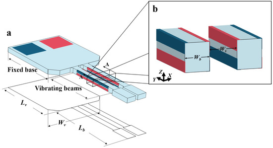 For clarity in characterizing the etching topography, the length definitions are induced: the length of the bottom of the etching groove (i.e., the 3D self-masking beam) is denoted by ; and represent the thickness and length of the junction between the 3D mask beam and the vibration beams, respectively; corresponds to the wafer thickness; and indicates the etching depth. In practical application, an appropriate initial hard mask width is selected based on the wafer thickness and the etching evolution results. After the etching grooves are patterned, a double-sided etching process is performed to form an H-type beam with a controlled thickness. At this stage, both ends of the mask beam remain connected to the vibration beams. Due to the presence of the junction thickness , the mask beam can serve as a 3D sidewall electrode mask. Subsequently, a metal film is deposited again onto the substrate via deposition for sputtering to form a secondary hard mask layer. After patterning, the metal layer on the self-masking beam is selectively removed, and both the vibration beams and mutually discrete 3D sidewall electrodes are simultaneously obtained.