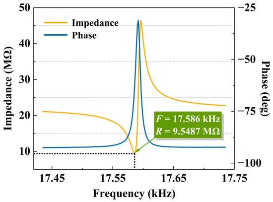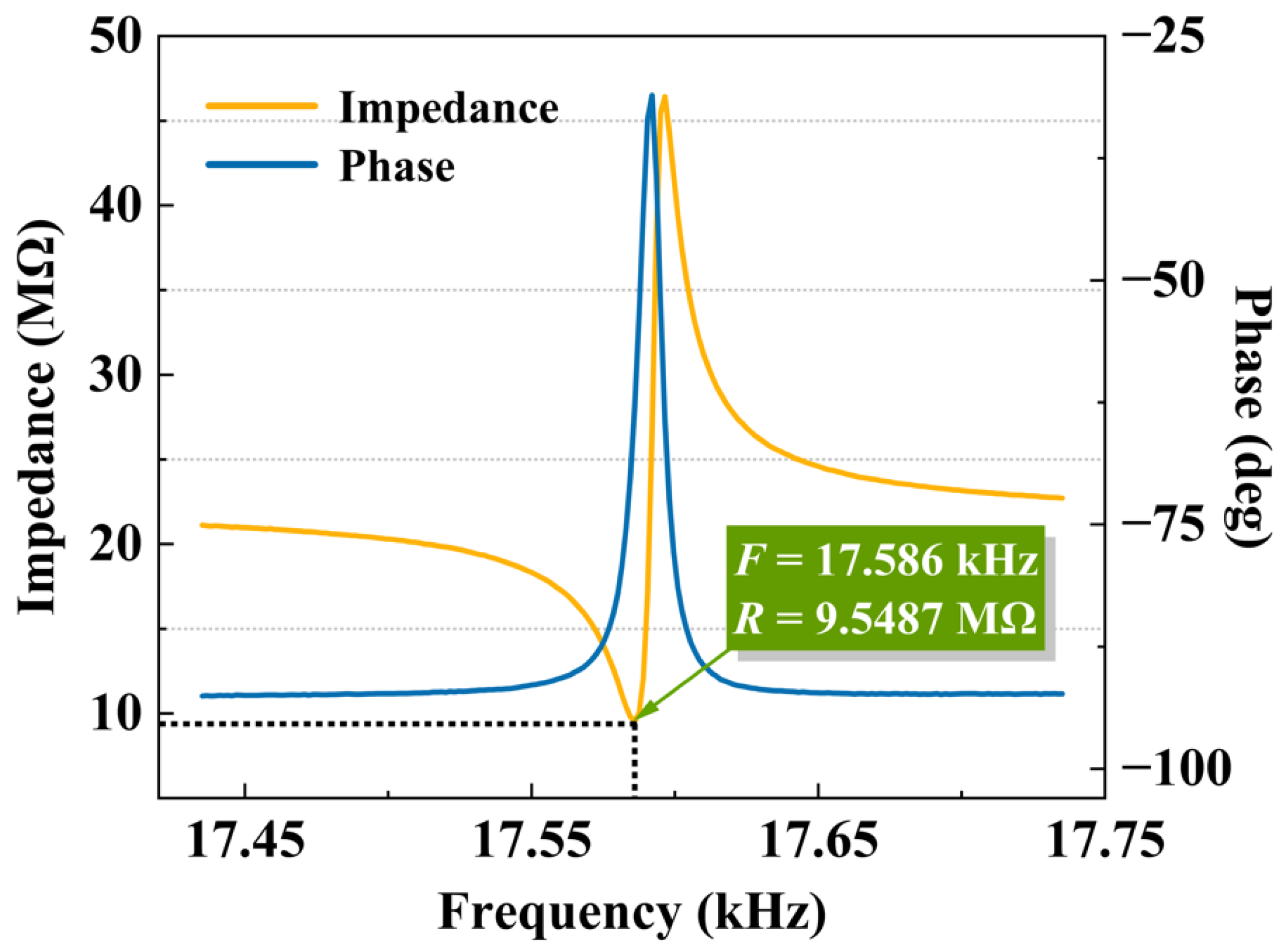 The vibration unit was tested using an impedance analyzer at normal atmospheric pressure, and the test results are shown in Figure 17. The resonant frequency was measured at 17.58 kHz, with a resonant impedance of 9.55 MΩ, both of which align with the design specifications.