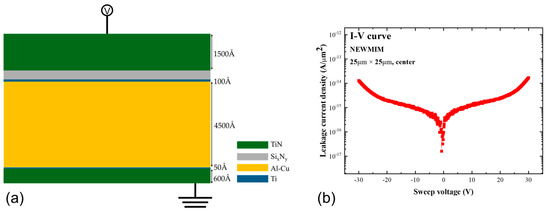 (a) Schematic of fabricated MIM structure and (b) variation in leakage current density with sweep voltage for NEWMIM condition capacitor.