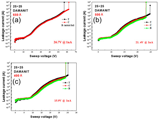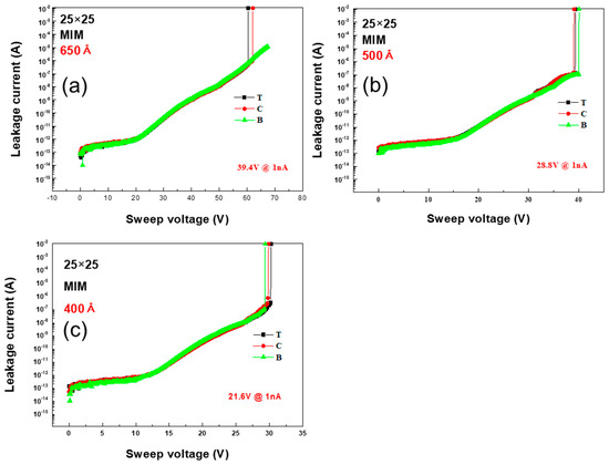 The BV measurements for the DAMANIT condition are shown in Figure 4a–c, which present the results for the wafer thicknesses of 650 Å, 500 Å, and 400 Å, respectively; the BV values were 26.7 V, 21.4 V, and 15.9 V for each thickness with the center as the reference. As with the MIM condition, the leakage current behavior for every thickness was the same at the top, center, and bottom of the wafer; however, the BV values were slightly lower.