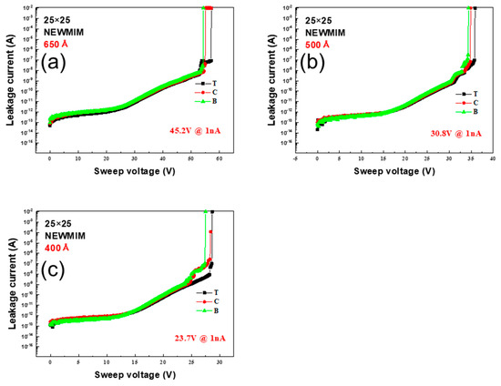 The BV measurements for the NEWMIM condition are shown in Figure 3. Specifically, Figure 3a–c present the results for the wafer thicknesses of 650 Å, 500 Å, and 400 Å, respectively; the BV values were 45.2 V, 30.8 V, and 23.7 V for each thickness with the center as the reference. As with the MIM condition, the leakage current behavior for every thickness was the same at the top, center, and bottom of the wafer, although the BV values were slightly higher.