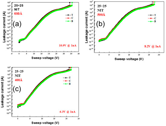 Figure 5 shows the BV measurements for the NIT condition. Specifically, Figure 5a–c depict the results for the wafer thicknesses of 650 Å, 500 Å, and 400 Å, respectively; the BV values were 10.9 V, 8.2 V, and 6.3 V for each thickness with the center as the reference. As with the MIM condition, the leakage current behavior for all the thicknesses was the same at the top, center, and bottom of the wafer; however, the BV values were the lowest among all the conditions.