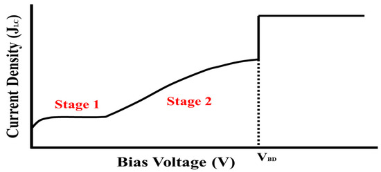 The general I–V characteristics of the MIM capacitor are illustrated in Figure 6. In the initial stage, electrons are injected across the energy barrier between the electrode and dielectric or are captured at trap sites under an applied electric field. Conduction behavior is governed by the Poole–Frenkel mechanism, wherein thermally activated electrons induce a linear relationship between J (Current)/E (Electric Field) and √E [31,32]. As the bias increases, the available trap sites are progressively saturated, leading to a transition into Stage 2. In this regime, enhanced field emission and detrapping phenomena become dominant [33], resulting in a rapid escalation of current that signifies the onset of dielectric degradation, and when a critical bias is applied, the band bending is amplified, and the tunneling effect, which is minimal in Stages 1 and 2, is maximized, resulting in physical and electrical breakdown [5]. In this study, the breakdown voltage (BV) of the MIM capacitors was operationally defined as the voltage at which the leakage current exceeded 1 nA. Accordingly, the BV corresponds to the bias voltage at which the transition to Stage 2 commences in Figure 6.