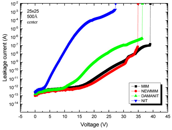 The BV values of the MIM capacitors for every SixNy layer thickness and deposition condition are summarized in Table 4. For all conditions, the BV decreased with thickness. Among the four conditions, the NEWMIM condition provided the best BV value for a given thickness; for the remaining conditions, the BV values decreased in the order of MIM, DAMANIT, and NIT. In MIM capacitors, the leakage current exhibits a strong inverse dependence on dielectric thickness, primarily due to enhancement of the internal electric field as the thickness decreases. A thinner dielectric layer leads to higher field-assisted emission processes such as Poole–Frenkel conduction, thereby resulting in an exponential increase in leakage current density [31,34].