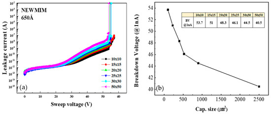 (a) Variation in leakage current with sweep voltage and (b) variation in breakdown voltage for MIM capacitors of different sizes.