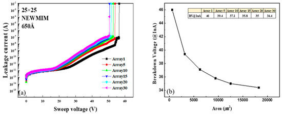 To understand the relationship between the BV characteristics and capacitor size, the BV values were measured for the 10 × 10, 15 × 15, 20 × 20, 25 × 25, 30 × 30, and 50 × 50 µm2 capacitors fabricated using the NEWMIM condition with the 650 Å insulator thickness. Figure 8a shows the I–V curves, while Figure 8b shows the change in the BV with increasing capacitor size. The BV value is observed to decrease by up to 24.5% as the capacitor size increases. Also, to evaluate the dependence of the BV characteristics on the number of capacitor arrays, the BV values were measured for 1, 5, 10, 15, 20, and 30 arrays of the 25 × 25 µm2 capacitor fabricated using the NEWMIM condition with the 650 Å insulator thickness. Figure 9a shows the I–V curve, and Figure 9b shows the change in the BV value with the number of arrays. As the number of arrays (i.e., as the capacitance area) increases, the BV decreases by up to 24.7%.