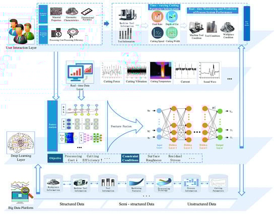 The user interaction layer is mainly used for information exchange with the user and visualization of the cutting process. The information input of the system is transmitted to the deep learning layer through this layer. After model analysis, the basic information, such as the machine tool and tool, is first fed back to the user, and the user can choose the machine tool and tool themselves. After user confirmation, the deep learning layer will be based on the information of the real-time data layer, real-time feed f, back cutting amount ap, cutting width ae, cutting speed vc, and other data through the form of dynamic curves for user visualization. At the same time, through the support of the deep learning layer, users can intuitively see the deformation of the workpiece, the wear of the tool, the energy consumption of the machine tool, etc., to achieve the purpose of monitoring the state of the workpiece, the state of the tool, and the state of the machine tool.