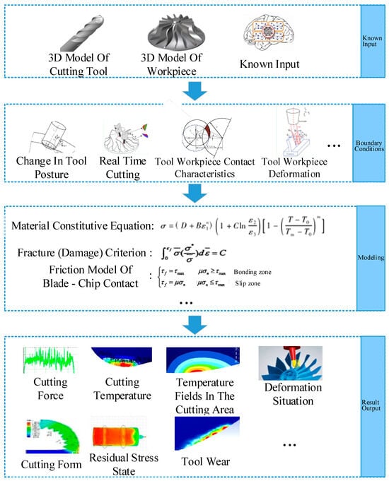 In the field of metal cutting, using finite element simulation software to predict the cutting force, cutting temperature, workpiece deformation, chip shape, and machining quality in the process of cutting has become a very effective means. However, the typical low-rigidity parts of aerospace and aviation have high precision requirements and are all thin-walled parts with complex curved surfaces. In the cutting process, deformation and vibration are large, and the simulation theoretical model adopted in the conventional cutting process cannot achieve the expected simulation effect. Therefore, the simulation process for the cutting of low-rigidity parts is proposed in this paper, as shown in Figure 5.