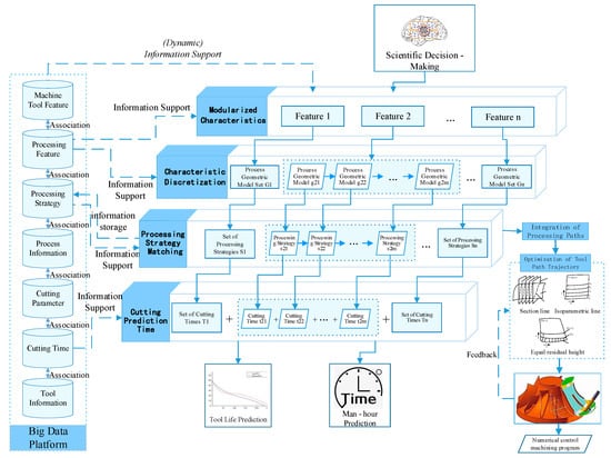In the process of feature-based intelligent process planning, the tool path in actual machining is composed of discrete tool position data in motion order, so the tool path can be regarded as a collection of tool position data. The process includes feature modularization, feature discretization, machining strategy matching, machining path integration, and machining tool path optimization, and finally, the NC machining program is automatically obtained. At the same time, it can also predict the cutting time and the remaining life of the tool, and obtain the processing time of the part. The big data platform provides data support for the realization of the intelligent process planning process, including machine tool characteristics, machining characteristics, machining decisions, process information, cutting parameters, cutting time, and tool information.