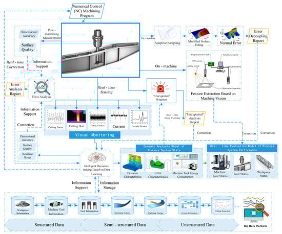 At the same time, with the support of intelligent decision-making, the workpiece should be simulated cutting before the actual processing, and the data generated in the simulation processing process is processed and analyzed. In order to achieve efficient and accurate cutting, the machining error should be predicted. For the machining process prediction and online compensation, for example, by considering the stiffness changes of low-rigidity parts at different stages [31] and the machine tool space error [43], etc., the optimal spatial error model, which comprehensively reflects geometric error, thermal error, and cutting force error, is established to predict the mechanical deformation, thermal deformation and residual stress deformation of low-rigidity parts in simulation analysis.