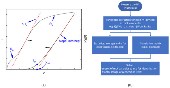 (a) Typical forward I-V characteristics of a diode and suggested parameters to extract (n, Is, Von, Ion) from each region. (b) Flowchart describing the steps followed from the start (measuring the I-Vs of N similar devices) until the end of the workflow. The result is to select the minimum efficient subset of recognition parameters and maximum acceptable recognition limits—in terms of the standard deviation σ-, necessary for a successful device identification within the ensemble, or other possible devices under test.