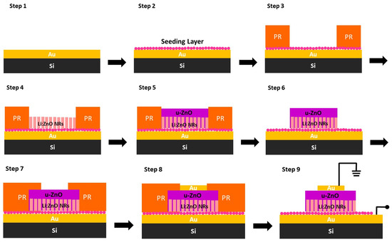 The ZnO homojunction devices were fabricated following a two-step solution-based process, which has already been employed in previous works and has been proven to be compatible with standard micro/nanofabrication techniques [15,27,28,29,30,33]. All chemicals were used as obtained without any further purification.
