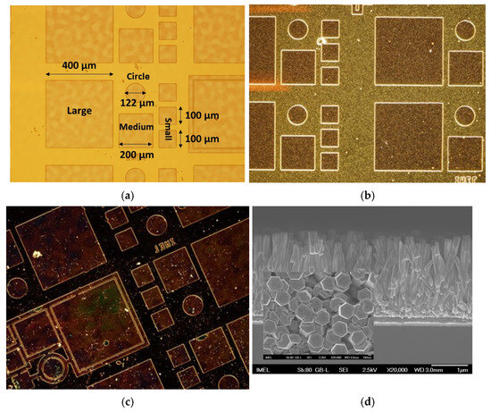 - Positive-tone optical lithography was performed to selectively grow ZnO nanostructures within the defined patterns. These patterns on each die included circles with diameters of 112 μm, as well as squares with side lengths of 100 μm, 200 μm, and 400 μm (Figure 3a,b). Based on their shapes and sizes, the devices will be hereafter referred to as “circles” for the circular devices and as “small”, “medium”, and “large” for the square ones.