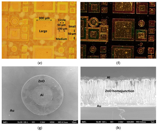 Figure 3. Representative optical microscope images (magnification ×10) of the device patterns after the hydrothermal growth of the Li:ZnO NR layer: (a) bright field and (b) dark-field image. (c) Optical microscope image (magnification ×10; dark field) and (d) SEM cross-sectional image (scale bar: 1 μm) after the 2nd growth step of the undoped ZnO nanotextured layer on top of the Li:ZnO NRs for the formation of the chemically produced homojunction. Inset in (d): top view of the homojunction demonstrating the coalescence of the u-ZnO NRs and the formation of the nanotextured film on top of which the top contact will be formed (scale bar: 100 nm). Optical microscope images (magnification ×10) after the deposition of the top Al electrode: (e) bright field and (f) dark field. SEM images after the deposition of the top Al electrode: (g) top view (scale bar: 10 μm) and (h) cross section (scale bar: 1 μm). - (4)
